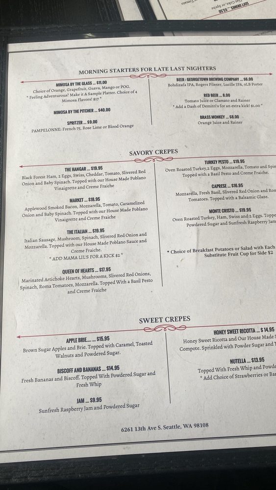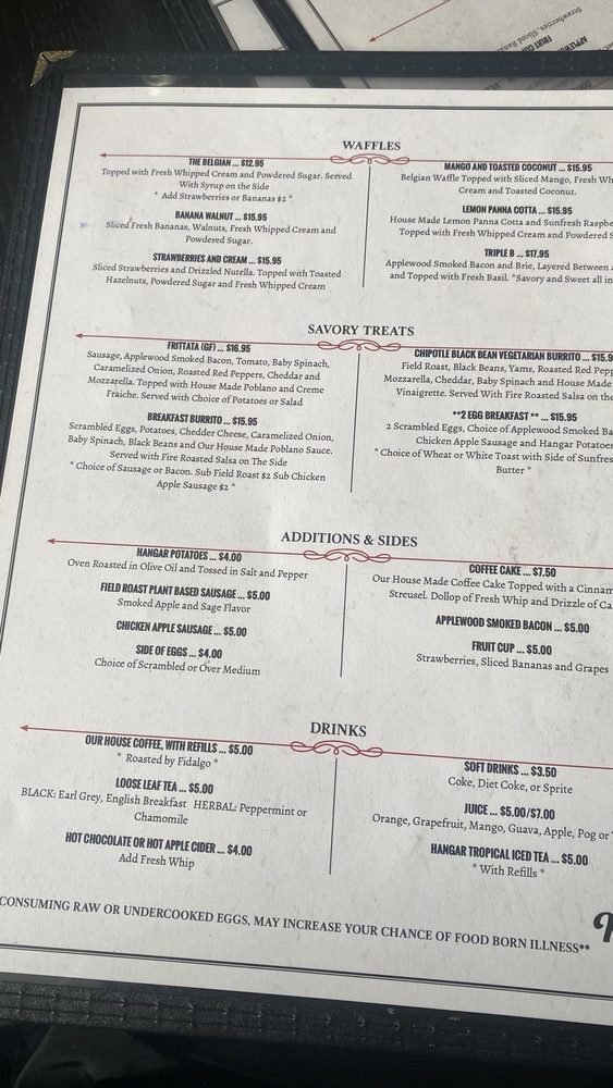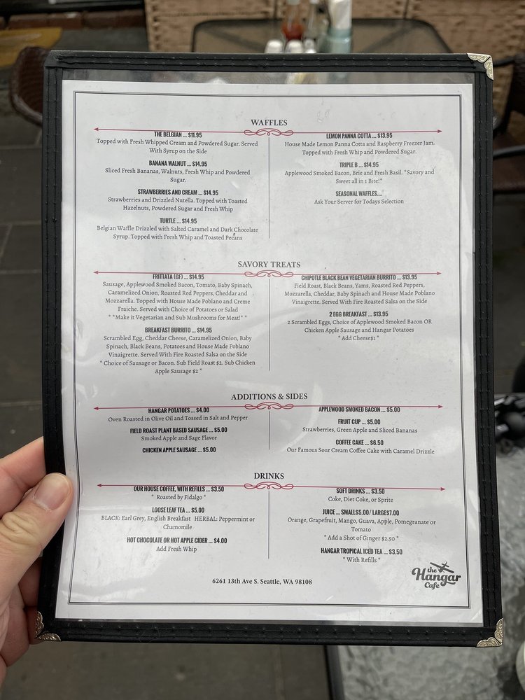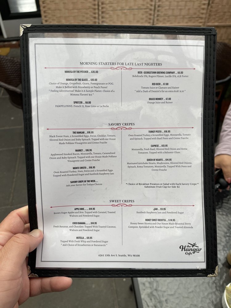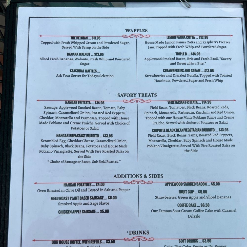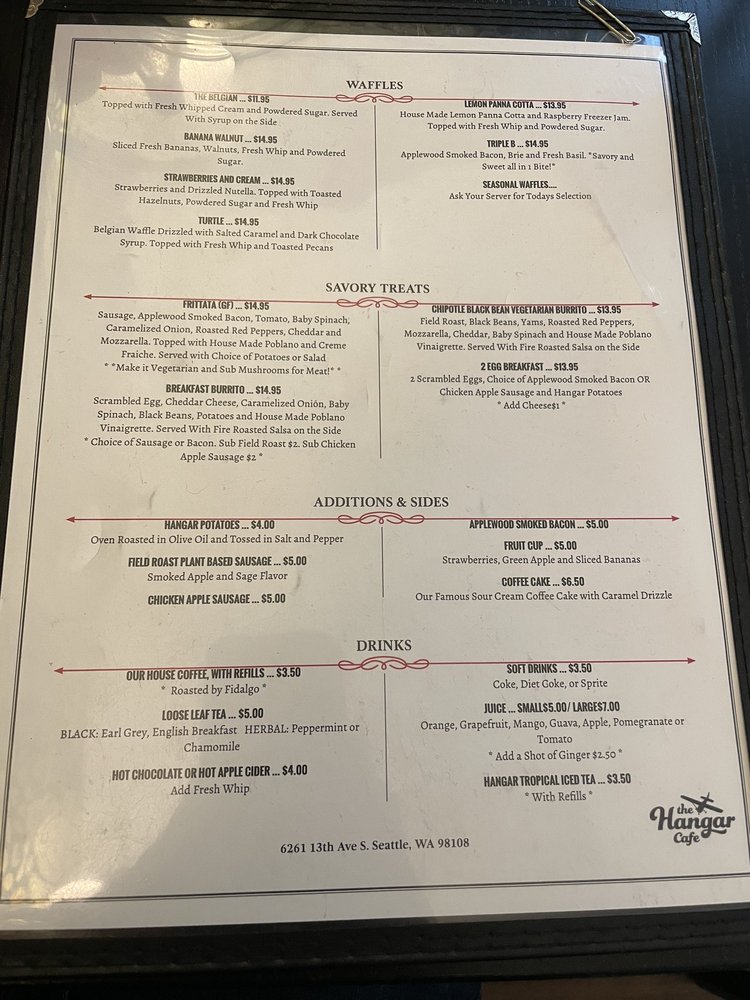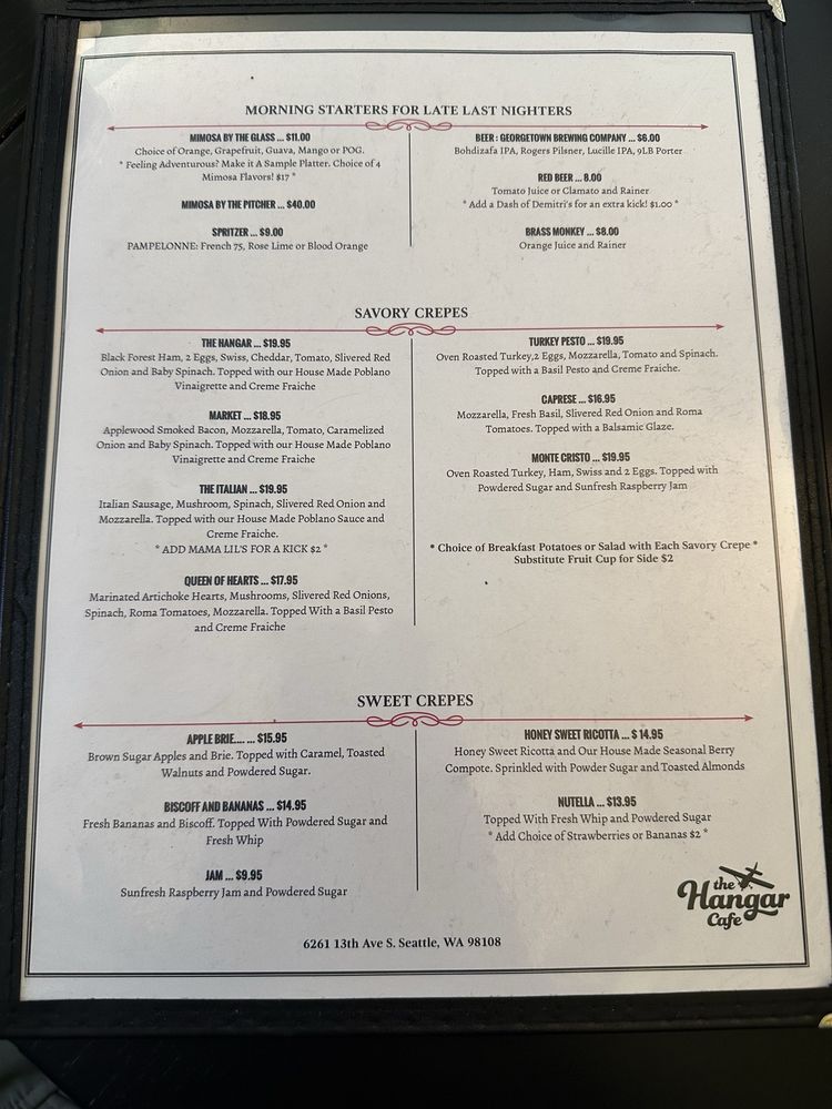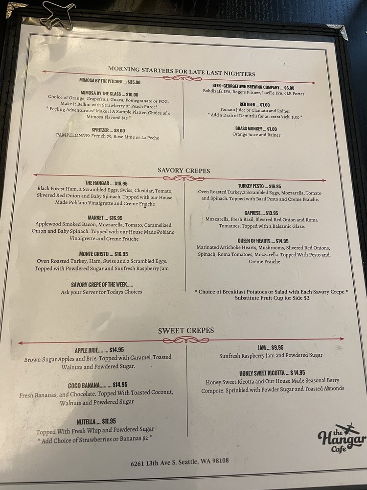 Hangar Cafe, located in Seattle, offers a warm and inviting atmosphere with indoor and outdoor seating options. The menu features a variety of options, including savory crepes, salads, sandwiches, and a Soup De Jour. The café prides itself on its strong and delicious coffee, as well as its accommodating staff who provide attentive and friendly service. Customers have praised the flavorful and satisfying food, with highlights such as the Queen of Hearts crepe and the Walnut Pear salad. The café is known for its cozy and intimate space, making it ideal for a relaxed breakfast, brunch, or lunch. With a focus on quality and customer satisfaction, Hangar Cafe stands out as a charming spot for a delicious meal in Seattle.
